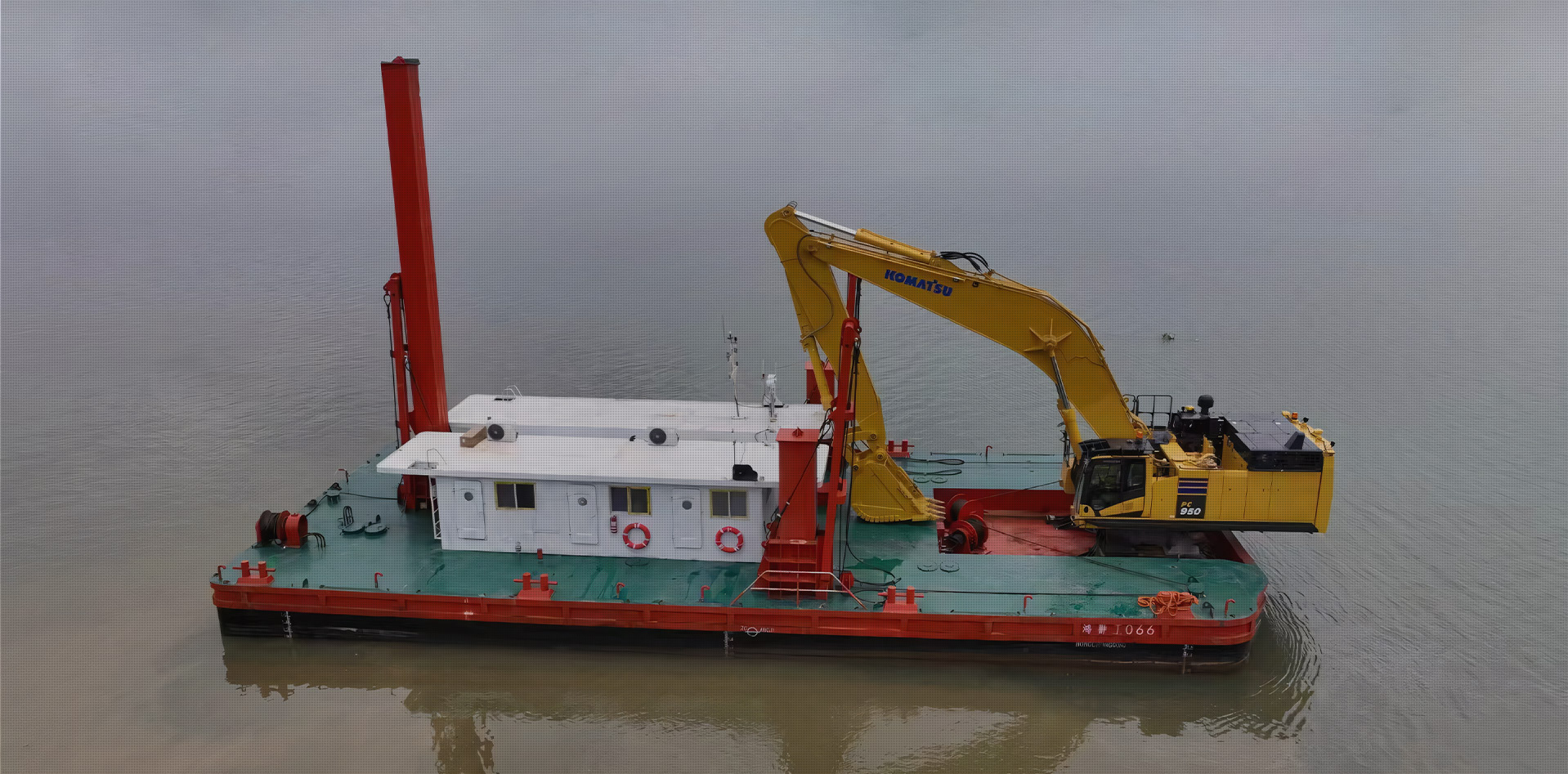 2、施工平臺穩性強,方便挖掘機在深水區施工作業。并且,平臺自帶航行動力,便于水上調遣。